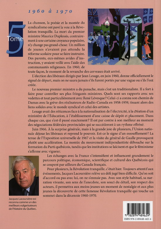 La chanson, la poésie et la montée du syndicalisme ont pavé la voie à la Révolution tranquille. La mort du premier ministre Maurice Duplessis, contrairement à une certaine croyance populaire, n’y change pas grand-chose. Un million de jeunes n'avaient pas attendu la réforme scolaire pour se faire instruire. Des parents, eux-mêmes avides d’instruction, y avaient veillé avecl’aide des communautés religieuses. En 1960, de toute façon, le moment de la revanche des cerveaux était arrivé. L’élection des libéraux dirigés par Jean Lesage,en juin 1960, donne officiellement le signal de départ, mais on ne saura jamais s’ils furent portés par une vague ou s’ils l’ont créée. Le nouveau premier ministre a du panache, mais c’est un traditionaliste. Il a fort à faire pour contrôler ses plus fringants ministres. Quels sont ses rapports avec ses vedettes et tout particulièrement avec René Lévesque ? Celui-ci a connu son chemin de Damas avec la grève des réalisateurs de Radio-Canada en 1958-1959, tissant alors des liens solides avec le monde syndical et celui des artistes. Lesage avait des réticences face à la nationalisation de l’électricité, à la création d’un ministère de l’Éducation, à l’établissement d’une caisse de dépôt et placement. Dans chaque cas, que s’est-il passé exactement ? Il est par contre à son meilleur au moment des négociations fédérales-provinciales qui se succéderont à un rythme effréné. Juin 1966. À la surprise générale, mais à la grande joie de plusieurs, l’Union nationale déjoue les libéraux et reprend le pouvoir. Est-ce le signe d’un essoufflement ? La tenue de l’Exposition universelle de 1967 et la visite du général de Gaulle provoquent plutôt une accélération. La montée du mouvement indépendantiste débouche sur la formation du Parti québécois, tandis que les institutions se laïcisent et que le féminisme s’affirme avec vigueur. Les échanges avec la France s’intensifient et influencent grandement le parcours politique, économique, scientifique et culturel des Québécois qui se coupent par ailleurs du Canada français. Pour plusieurs, la Révolution tranquille, c’était hier. Toujours attentif aux événements, Jacques Lacoursièrere lève un défi jugé bien difficile. Qu’on soit d’accord ou pas avec lui, on ne s’ennuie pas. Avec son style habituel, sa narration vivante, son sens de l’anecdote, son souci du détail, son respect des acteurs, il permettra aux moins jeunes un moment de nostalgie et aux plus jeunes la découverte de cette fameuse Révolution tranquille qui touche un sommet dans la décennie 1960-1970. Jacques Lacoursière est reconnu comme un des meilleurs vulgarisateurs de l’histoire du Québec.