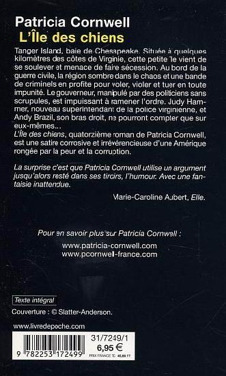 Tanger Island, baie de Chesapeake. Située à quelques kilomètres des côtes de Virginie, cette petite île vient de se soulever et menace de faire sécession. Au bord de la guerre civile, la région sombre dans le chaos et une bande de criminels en profite pour voler, violer et tuer en toute impunité. Le gouverneur, manipulé par des politiciens sans scrupules, est impuissant à ramener l'ordre. Judy Hammer, nouveau superintendant de la police virginienne, et Andy Brazil, son bras droit, ne pourront compter que sur eux-mêmes.... L'île des chiens, quatorzième roman de Patricia Cornwell, est une satire corrosive et irrévérencieuse d'une Amérique rongée par la peur et la corruption.. La surprise c'est que Patricia Cornwell utilise un argument jusqu'alors resté dans ses tiroirs, l'humour. Avec une fantaisie inattendue..