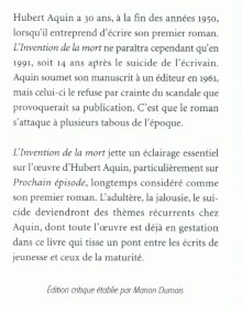 Dès les premiers mots de ce roman, écrit en 1959 et resté inédit jusqu’au début des années 1990, les dés sont jetés : « Tout est fini. » Entre le désespoir et la folie, le journaliste René Lallemant revoit en accéléré les étapes de sa relation avec Madeleine Vallin et fait parallèlement le procès impitoyable de sa grande fatigue existentielle. C’est un roman sur la jalousie, qu’on lit presque comme un journal personnel où tous les masques tombent, et, en premier, celui de la fiction littéraire. L’Invention de la mort porte déjà, six ans avant la publication de Prochain épisode, les signes d’une écriture fulgurante qui va marquer la littérature québécoise. Encore une fois, Hubert Aquin ébranle ses lecteurs avec la provocation et la force unique de son écriture. Avec tout ce que l’on sait maintenant sur le destin d’Aquin, on ne sort pas de ce roman la conscience tranquille.