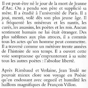 J. Teulé se glisse ici dans la peau du père de la poésie moderne, F. Villon. Il met en scène la vie mouvementée du poète, depuis sa naissance le jour où Jeanne d'Arc périt sur un bûcher, jusqu'à sa trente et unième année, où il disparut mystérieusement, orphelin solitaire et vagabond.