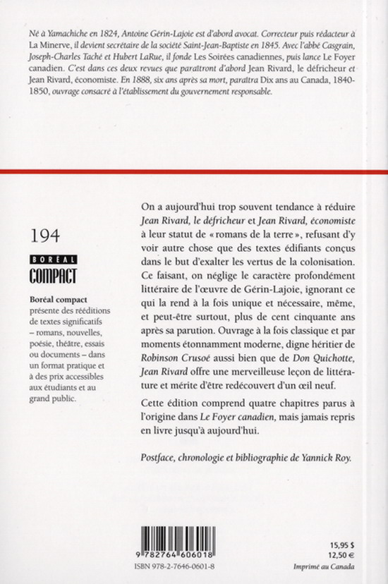 On a aujourd’hui trop souvent tendance à réduire Jean Rivard, le défricheur et Jean Rivard, économiste à leur statut de « romans de la terre », refusant d’y voir autre chose que des textes édifiants conçus dans le but d’exalter les vertus de la colonisation. Ce faisant, on néglige le caractère profondément littéraire de l’oeuvre de Gérin-Lajoie, ignorant ce qui la rend à la fois unique et nécessaire, même, et peut-être surtout, plus de cent cinquante ans après sa parution. Ouvrage à la fois classique et par moments étonnamment moderne, digne héritier de Robinson Crusoé aussi bien que de Don Quichotte, Jean Rivard offre une merveilleuse leçon de littérature et mérite d’être redécouvert d’un œil neuf.