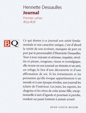 Le premier cahier du Journal d'Henriette Dessaulles va de septembre 1874 à septembre 1876. Au début du cahier, Henriette a quatorze ans, c'est la rentrée au couvent de Lorette à Saint-Hyacinthe ; à la fin, elle se prépare à devenir pensionnaire au couvent de la Présentation. Dans l'intervalle, elle note ses joies, ses chagrins, ses espoirs et ses désillusions, alors qu'elle affronte les contrariétés de sa belle-mère, scrute ses sentiments à l'égard de son jeune voisin, Maurice Saint-Jacques, et fait la connaissance d'un jeune musicien américain atteint d'une maladie mortelle. C'est à l'aune de l'expérience quotidienne qu'Henriette Dessaulles interroge les grandes vérités. Considérant avec une étonnante acuité critique le comportement de ses contemporains, elle porte sur son temps et sur son milieu un regard neuf, décapant. Un texte d'une exceptionnelle qualité, tout en mouvements du coeur et de l'esprit, une écriture à la mesure d'une personnalité exceptionnelle.