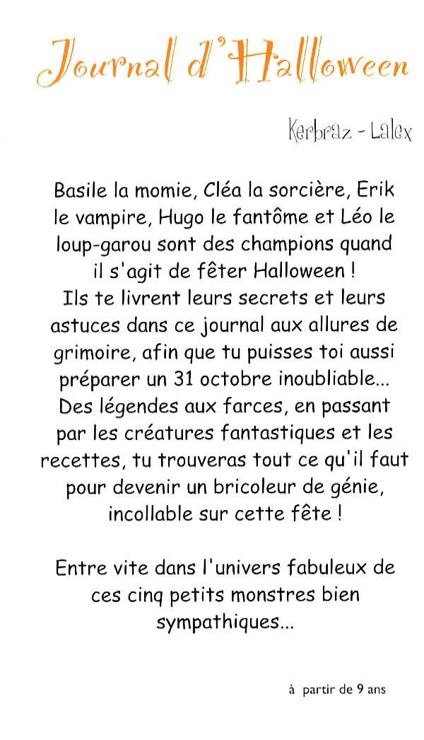 Cinq petits monstres (une momie, une sorcière, un vampire, un fantôme et un loup-garou) racontent les légendes sur les origines d'Halloween, présentent des personnages fantastiques : revenants, fées, sorcières, lutins, trolls et proposent des recettes et des idées pour se déguiser et réaliser une décoration sur le thème d'Halloween.