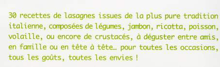 30 recettes de lasagnes issues de la plus pure tradition italienne, composées de légumes, jambon, ricotta, poisson, volaille, ou encore de crustacés, à déguster entre amis, en famille ou en tête-à-tête... pour toutes les occasions, tous les goûts, toutes les envies !