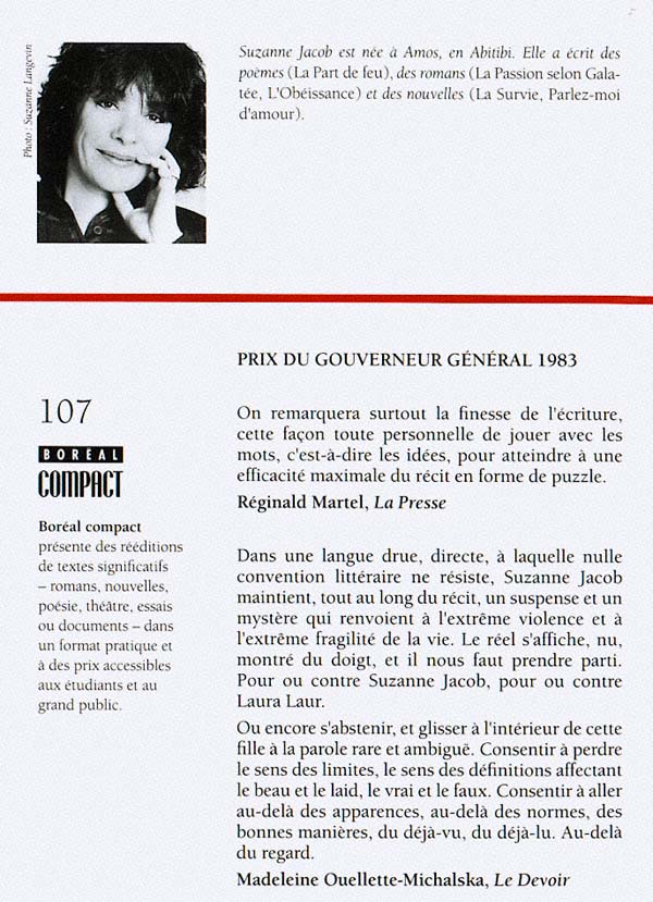 «On remarquera surtout la finesse de l'écriture, cette façon toute personnelle de jouer avec les mots, c'est-à-dire les idées, pour atteindre à une efficacité maximale du récit en forme de puzzle.» Réginald Martel, La Presse
