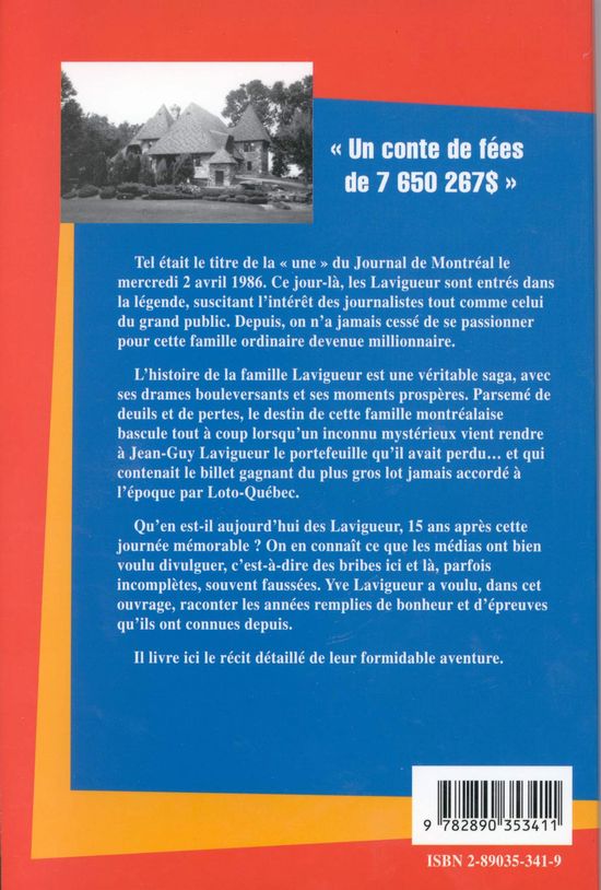 " Un conte de fées de 7 650 267$ " Tel était le titre de la " une " du Journal de Montréal le mercredi 2 avril 1985. Ce jour-là, les Lavigueur sont entrés dans la légende, suscitant l'intérêt des journalistes tout comme celui du grand public. Depuis, on n'a jamais cessé de se passionner pour cette famille ordinaire devenue millionnaire. L'histoire de la famille Lavigueur est une véritable saga, avec ses drames bouleversants et ses moments prospères. Parsemé de deuils et de pertes, le destin de cette famille montréalaise bascule tout à coup lorsqu'un inconnu mystérieux vient rendre à Jean-Guy Lavigueur le portefeuille qu'il avait perdu…. Et qui contenait le billet gagnant du plus gros lot jamais accordé à l'époque par Loto-Québec. Qu'en est-il aujourd'hui des Lavigeur, 15 ans après cette journée mémorable? On en connaît ce que les médias ont bien voulu divulguer, c'est-à-dire des bribes ici et là, parfois incomplètes, souvent faussées. Yve Lavigueur a voulu, dans cet ouvrage, raconter les années remplies de bonheur et d'épreuves qu'ils ont connues depuis. Il livre ici le récit détaillé de leur formidable aventure.