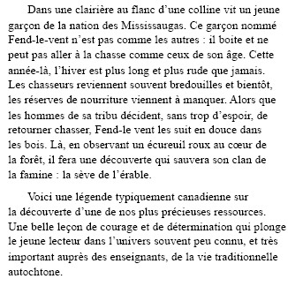 À la fin du livre, une note de l’auteure permet d’apprendre quelques légendes sur la découverte du sirop d’érable. Elle y explique aussi le long processus mis au point autrefois par les autochtones pour produire cette spécialité de l’Amérique du Nord.