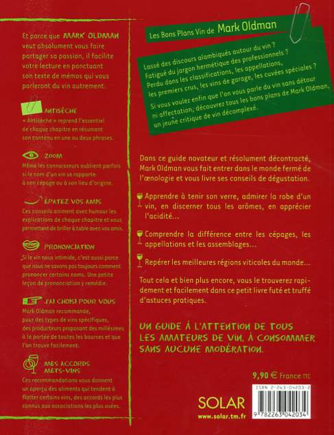 Dans ce guide novateur et résolument décontracté, Mark Oldman vous fait entrer dans le monde fermé de l'œnologie et vous livre ses conseils de dégustation. Apprendre à tenir son verre, admirer la robe d'un vin, en discerner tous les arômes, e, apprécier l'acidité... Comprendre la différence entre les cépages, les appellations et les assemblages... Repérer les meilleures régions viticoles du monde... Tout cela et bien plus encore, vous le trouverez rapidement et facilement dans ce petit livre futé et truffé d'astuces pratiques. Un guide à l'attention de tous les amateurs de vin, à consommer sans aucune modération.