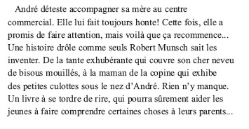 Pourquoi André voudrait-il aller au centre commercial avec sa mère? Elle lui fait toujours honte! Cette fois, elle a promis de faire attention, mais voilà que ça recommence... Et si, pour une fois, c'était elle qui était gênée?