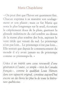 «On peut dire que l’hiver est quasiment fini. Chacun exprima à sa manière son soulagement et son plaisir; mais ce fut Maria qui resta le plus longtemps sur le seuil, écoutant le crépitement doux de la pluie, guettant la glissade indistincte du ciel sombre au-dessus de la masse plus sombre des bois, aspirant le vent tiède qui venait du sud. Le printemps n’est pas loin… Le printemps n’est pas loin… Elle sentait que depuis le commencement du monde il n’y avait jamais eu de printemps comme ce printemps-là.» Grâce à un intérêt sans cesse renouvelé d’une génération à l’autre, ce simple «récit du Canada français», comme le qualifiait Louis Hémon dans son tapuscrit original, constitue aujourd’hui encore un des livres les plus lus de toute la littérature québécoise..