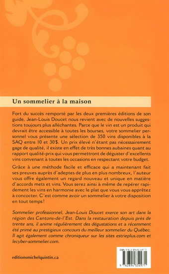 Parce que le vin est un produit qui devrait être accessible à toutes les bourses, votre sommelier personnel vous présente une sélection de 350 vins disponibles à la SAQ entre 10 et 30 $. Un prix élevé n'étant pas nécessairement gage de qualité, il existe en effet de très bonnes aubaines quant au rapport qualité-prix qui vous permettront de déguster d'excellents vins convenant à toutes les occasions en respectant votre budget. Grâce à une méthode facile et efficace qui a maintenannt fait ses preuves auprès d'adeptes de plus en plus nombreux, l'auteur vous offre également un regard nouveau et unique en matière d'accords mets et vins.