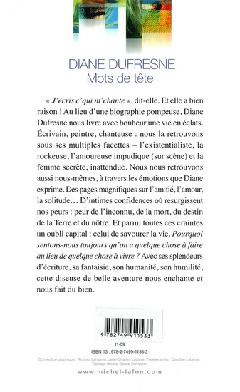Au lieu d'une biographie pompeuse, Diane Dufresne nous livre avec bonheur une vie en éclats. Écrivain, peintre, chanteuse : nous la retrouvons sous ses multiples facettes - l'existentialiste, la rockeuse, l'amoureuse impudique (sur scène) et la femme secrète, inattendue. Nous nous retrouvons aussi nous-mêmes, à travers les émotions que Diane exprime. Des pages magnifiques sur l'amitié, l'amour, la solitude...