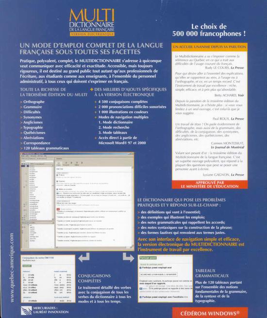 Cette édition multimédia, intégrant sons et images, poursuit l'objectif initial: constituer un mode d'emploi complet et actuel de la langue française sous toutes ses facettes, fournir les indications les plus pertinentes sur l'usage, neutraliser les frontières entre les diverses questions linguistiques. La version informatisée de cet ouvrage se distingue par l'ajout de plus de 2 000 prononciations difficiles sonorisées, des conjugaisons complètes de tous les verbes, des tableaux grammaticaux et des illustrations en couleurs. Pour faciliter son utilisation et multiplier les accès aux réponses recherchées, quatre modes de navigation sont proposés aux usagers soit le dictionnaire, la recherche, les tableaux et l'historique de consultation. Sa configuration permet d'y avoir accès au moyen du traitement de texte. Approuvé par le ministère de l'Éducation, voilà l'outil idéal pour tous ceux qui doivent s'exprimer en français et qui souhaitent le faire avec exactitude et efficacité.