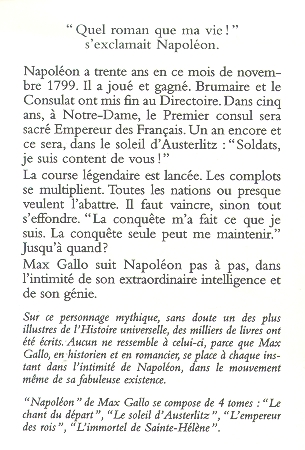 "Quel roman que ma vie !" s'exclamait Napoléon. Napoléon a trente ans en ce mois de novembre 1799. Il a joué et gagné. Brumaire et le Consulat ont mis fin au Directoire. Dans cinq ans, à Notre-Dame, le Premier consul sera sacré Empereur des Français. Un an encore et ce sera, dans le soleil d'Austerlitz : "Soldats, je suis content de vous !" La course légendaire est lancée. Les complots se multiplient. Toutes les nations ou presque veulent l'abattre. Il faut vaincre, sinon tout s'effondre. "La conquête m'a fait ce que je suis. La conquête seule peut me maintenir." Jusqu'à quand ? Max Gallo suit Napoléon pas à pas, dans l'intimité de son extraordinaire intelligence et de son génie.
