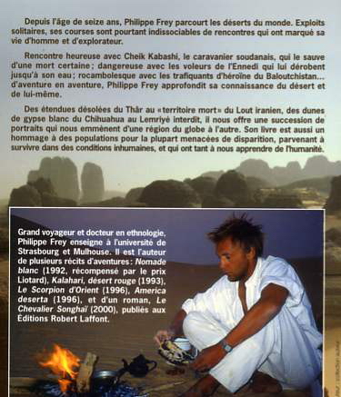 Depuis l'âge de seize ans, Philippe Frey parcourt les déserts du monde. Exploits solitaires, ses courses sont pourtant indissociables de rencontres qui ont marqué sa vie d'homme et d'explorateur. Rencontre heureuse avec Cheik Kabashi, le caravanier soudanais, qui le sauve d'une mort certaine ; dangereuse avec les voleurs de l'Ennedi qui lui dérobent jusqu'à son eau ; rocambolesque avec les trafiquants d'héroïne du Baloutchistan... d'aventure en aventure, Philippe Frey approfondit sa connaissance du désert et de lui-même. Des étendues désolées du Thâr au " territoire mort " du Lout iranien, des dunes de gypse blanc du Chihuahua au Lemriyé interdit, il nous offre une succession de portraits qui nous emmènent d'une région du globe à l'autre. Son livre est aussi un hommage à des populations pour la plupart menacées de disparition, parvenant à survivre dans des conditions inhumaines, et qui ont tant à nous apprendre de l'humanité.