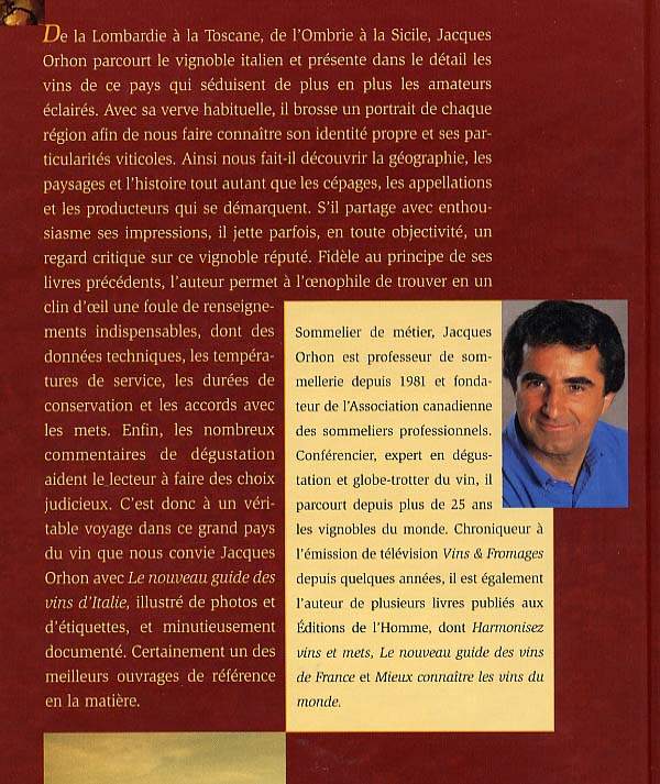 De la Lombardie à la Toscane, de l’Ombrie à la Sicile, Jacques Orhon parcourt les vignobles italiens et présente les vins de ce pays qui séduisent de plus en plus les amateurs éclairés. Avec sa verve habituelle, il brosse un portrait de chaque région afin de nous faire connaître son identité propre et ses particularités viticoles. Ainsi nous fait-il découvrir la géographie, les paysages et l’histoire tout autant que les cépages, les diverses appellations et les producteurs qui se démarquent. C’est donc à un véritable voyage dans ce grand pays du vin que nous convie Jacques Orhon avec Le nouveau guide des vins d’Italie illustré et minutieusement documenté. Certainement un des meilleurs ouvrages de référence en la matière.