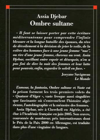 " Il faut se laisser porter par cette écriture méditerranéenne pour comprendre l'infinie blessure et la longue bataille des épouses, du rêve de dévoilement à la décision de jeter le voile, de la colère des hommes face à une jeune femme "nue", au rire d'une jeune femme, cheveux au vent. Assia Djebar, oscillant entre espoir et désespoir, n'en a pas fini de dire la nuit des femmes et leur lutte pour pouvoir, enfin, regarder le soleil en face. " L'amour, la fantasia, Ombre sultane et Vaste est la. prison forment les trois premiers volets du " Quatuor d'Alger ", vaste fresque aussi singulière que fascinante où s'entremêlent l'histoire algérienne, l'autobiographie et la mémoire des femmes.