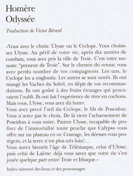 L'épopée d'Ulysse pour revenir de Troie, en Asie Mineure, jusqu'à sa terre natale, l'île d'Ithaque, dans la mer Ionienne, à l'ouest de la Grèce. Récit et conte merveilleux, cette épopée est, dans le monde antique, le texte fondateur source de toute culture. Texte intégral.