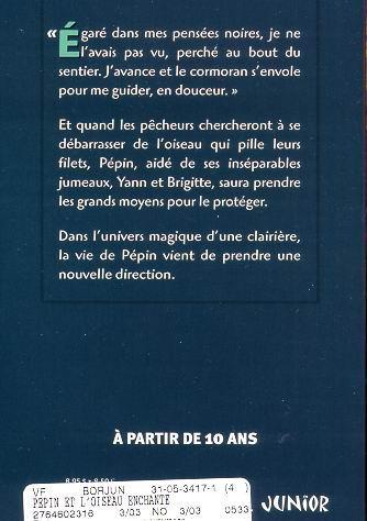 Égaré dans mes pensées noires, je ne l'avais pas vu, perché au bout du sentier. J'avance et le cormoran s'envole pour me guider, en douceur.» Et quand les pêcheurs chercheront à se débarrasser de l'oiseau qui pille leurs filets, Pépin, aidé de ses inséparables jumeaux, Yann et Brigitte, saure prendre les grands moyens pour le protéger. Dans l'univers magique d'une clairière, la vie de Pépin vient de prendre une nouvelle direction