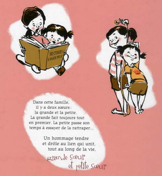 Dans cette famille, il y a deux soeurs : la grande et la petite. La grande fait toujours tout en premier. La petite passe son temps à essayer de la rattraper... Un hommage tendre et drôle au lien qui unit tout au long de la vie, grande soeur et petite soeur.