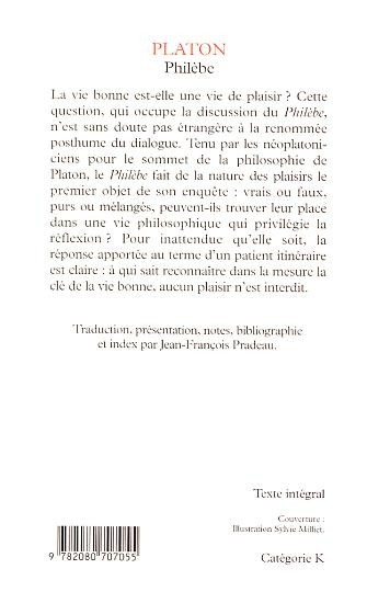 La vie bonne est-elle une vie de plaisir ? Cette question, qui occupe la discussion du Philèbe, n'est sans doute pas étrangère à la renommée posthume du dialogue. Tenu par les néoplatoniciens pour le sommet de la philosophie de Platon, le Philèbe fait de la nature des plaisirs le premier objet de son enquête : vrais ou faux, purs ou mélangés, peuvent-ils trouver leur place dans une vie philosophique qui privilégie la réflexion ? Pour inattendue qu'elle soit, la réponse apportée au terme d'un patient itinéraire est claire : à qui sait reconnaître dans la mesure la clé de la vie bonne, aucun plaisir n'est interdit.