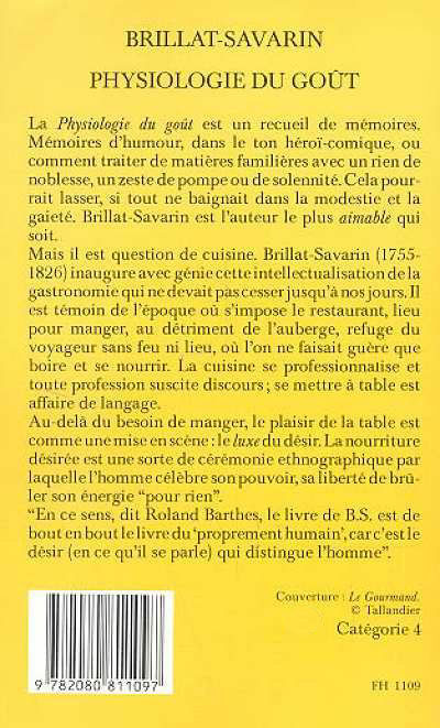 La Physiologie du goût est un recueil de mémoires. Mémoires d'humour, dans le ton héroï-comique, ou comment traiter de matières familières avec un rien de noblesse, un zeste de pompe ou de solennité. Cela pourrait lasser, si tout ne baignait dans la modestie et la gaieté. Brillat-Savarin est l'auteur le plus aimable qui soit.. Mais il est question de cuisine. Brillat-Savarin (1755-1826) inaugure avec génie cette intellectualisation de la gastronomie qui ne devait pas cesser jusqu'à nos jours. Il est témoin de l'époque où s'impose le restaurant, lieu pour manger, au détriment de l'auberge, refuge du voyageur sans feu ni lieu, où l'on ne faisait guère que boire et se nourrir. La cuisine se professionnalise et toute profession suscite discours ; se mettre à table est affaire de langage.. Au-delà du besoin de manger, le plaisir de la table est comme une mise en scène : le luxe du désir. La nourriture désirée est une sorte de cérémonie ethnographique par laquelle l'homme célèbre son pouvoir, sa liberté de brûler son énergie "pour rien".. "En ce sens, dit Roland Barthes, le livre de B.S. est de bout en bout le livre du `proprement humain', car c'est le désir (en ce qu'il se parle) qui distingue l'homme"..