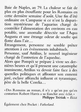 Baie de Naples, an 79. La chaleur se fait de plus en plus étouffante pour les Romains en cette dernière semaine d'août. Une fin d'été ordinaire en Campanie si ce n'est la disparition mystérieuse de l'aquarius chargé de contrôler l'alimentation des environs en eau potable, une anomalie détectée sur l'Aqua Augusta et une étrange odeur de soufre qui flotte dans l'air... Etrangement, personne ne semble prêter attention à ces événements inhabituels. Personne, sauf Attilius, le nouvel ingénieur chargé de l'entretien de l'aqueduc. Alors que Pompéi se prépare à vivre ses dernières heures et qu'il pressent une catastrophe imminente, Attilius va devoir faire face à des querelles politiques et affronter son ennemi juré, esclave affranchi influent et tyrannique, père de la belle Corelia...