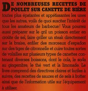 Outre le légendaire poulet sur cannette de bière - né sur le circuit du barbecue, il constitue le mets de volaille parfait, croustillant à l'extérieur, délicieusement tendre à l'intérieur, et débordant de saveurs -, vous trouverez dans ce livre des douzaines d'excellentes recettes, variantes et techniques, toutes plus épatantes et divertissantes les unes que les autres. Vous pourrez préparer sur le gril un poisson entier en croûte de sel, faire griller un steak directement sur la braise, enfiler des morceaux d'espadon sur des tiges de citronnelle et cuire toutes sortes de volailles sur plusieurs types de cannettes contenant diverses boissons. Le livre comprend des directives claires et faciles à suivre, des recettes de sauces et de sels à frotter ainsi que de l'information utile sur l'équipement à utiliser.