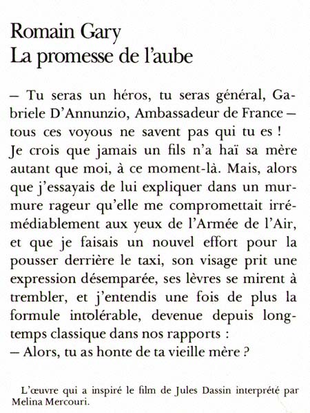 La promesse de l'aube . « - Tu seras un héros, tu seras général, Gabriele D'Annunzio, Ambassadeur de France - tous ces voyous ne savent pas qui tu es !. Je crois que jamais un fils n'a haï sa mère autant que moi, à ce moment-là. Mais, alors que j'essayais de lui expliquer dans un murmure rageur qu'elle me compromettait irrémédiablement aux yeux de l'Armée de l'Air, et que je faisais un nouvel effort pour la pousser derrière le taxi, son visage prit une expression désemparée, ses lèvres se mirent à trembler, et j'entendis une fois de plus la formule intolérable, devenue depuis longtemps classique dans nos rapports : - Alors, tu as honte de ta vieille mère ? ».