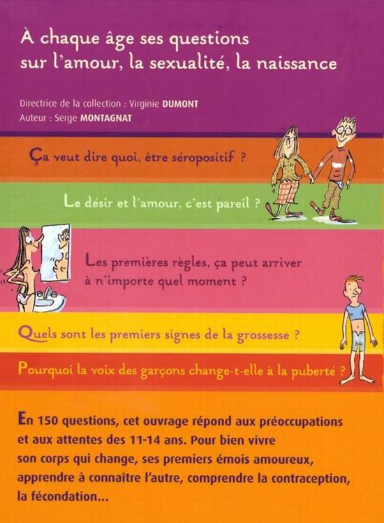 A chaque âge ses questions sur l'amour, la sexualité, la naissance. Ca veut dire quoi être séropositif ? Le désir et l'amour, c'est pareil ? Les premières règles, ça peut arriver à n'importe quel moment ? Quels sont les premiers signes de la grossesse ? Pourquoi la voix des garçons change-t-elle à la puberté ? En 150 questions, cet ouvrage répond aux préoccupations et aux attentes des 11-14 ans. Pour bien vivre son corps qui change, ses premiers émois amoureux, apprendre à connaître l'autre, comprendre la contraception, la fécondation...