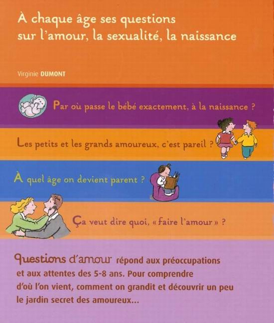 Par où passe le bébé exactement, à la naissance ? Les petits et les grands amoureux, c'est pareil ? Ça veut dire quoi, " Faire l'amour " ? Questions d'amour répond aux préoccupations et aux attentes des 5-8 ans. Pour comprendre d'où l'on vient, comment on grandit et découvrir un peu le jardin secret des amoureux...