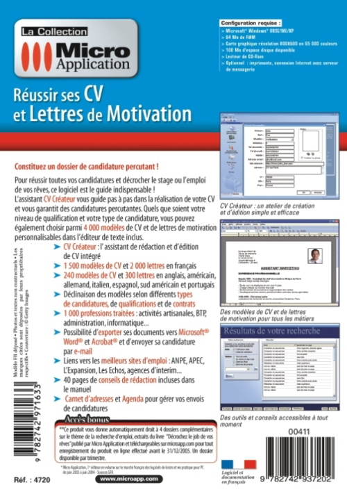 - Le programme vous propose aussi : - 250 CV et 300 lettres en langues étrangères : anglais (exemples britanniques et américains), allemand, espagnol (exemples espagnols et sud-américains), italien et portugais - Liens vers les meilleurs sites de recherche d'emploi : ANPE, APEC, L'Expansion, Les Échos, agences d'intérim, Ministères… - 50 pages de conseils de rédaction incluses dans le manuel - Possibilité d'exporter vos documents vers Microsoft® Word® ou au format .pdf - Carnet d’adresses et Agenda pour gérer vos envois de candidatures