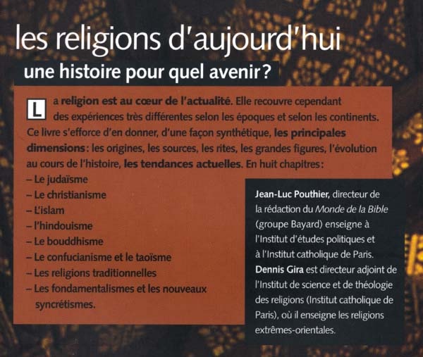 La religion est au coeur de l'actualité. Elle recouvre cependant des expériences très différentes selon les époques et selon les continents. Ce livre s'efforce d'en donner, d'une façon synthétique, les principales dimensions : les origines, les sources, les rites, les grandes figures, l'évolution au cours de l'histoire, les tendances actuelles. En huit chapitres : Le judaïsme, le christianisme, l'islam, l'hindouisme, le confucianisme et le taoïsme, les religions traditionnelles, les fondamentalismes et les nouveaux syncrétismes.