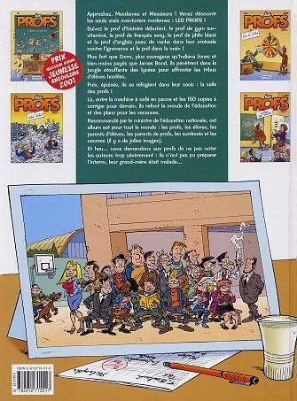 Approchez, Mesdames et Messieurs ! Venez découvrir les seuls vrais aventuriers modernes : Les profs !. Suivez le prof d'histoire débutant, le prof de gym survitaminé, la prof de français sexy, le prof de philo blasé et la prof d'anglais peau de vache dans leur croisade contre l'ignorance et le poil dans la main !. Plus fort que Zorro, plus courageux qu'Indiana Jones et bien moins payés que James Bond, ils pénètrent dans la jungle étouffante des lycées pour affronter les tribus d'élèves hostiles.. Puis, épuisés, ils se réfugient dans leur oasis : la salle des profs !. Là, entre la machine à café en panne et les 150 copies à corriger pour demain, ils refont le monde de l'éducation et des plans pour les vacances.. Recommandé par le ministre de l'éducation nationale, cet album est pour tout le monde : les profs, les élèves, les parents d'élèves, les parents de profs, les surdoués et les cancres (il y a de jolies images).. Et heu... nous demandons aux profs de ne pas noter les auteurs trop sévèrement : ils n'ont pas pu préparer l'interro, leur grand-mère était malade....