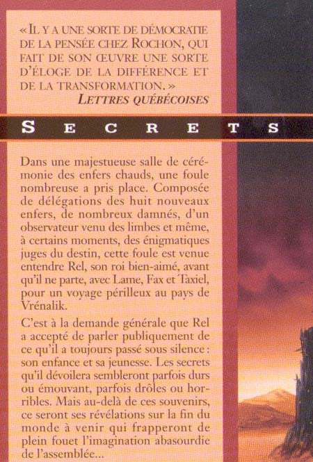 Dans une majestueuse salle de cérémonie des enfers chauds, une foule nombreuse a pris place. Composée de délégations des huit nouveaux enfers, de nombreux damnés, d'un observateur venu des limbes et même, à certains moments, des énigmatiques juges du destin, cette foule est venue entendre Rel, son roi bien-aimé, avant qu'il ne parte, avec Lame, Fax et Taxiel, pour un voyage périlleux au pays de Vrénalik. C'est à la demande générale que Rel a accepté de parler publiquement de ce qu'il a toujours passé sous silence : son enfance et sa jeunesse. Les secrets qu'il dévoilera sembleront parfois durs ou émouvant, parfois drôles ou horribles. Mais au-delà de ces souvenirs, ce seront ses révélations sur la fin du monde à venir qui frapperont de plein fouet l'imagination abasourdie de l'assemblée...