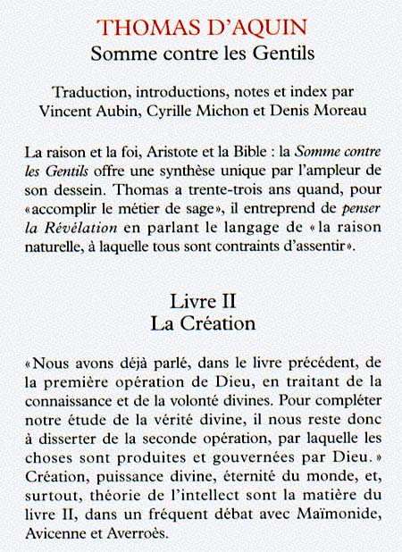 Rédigée à partir de 1258, cette oeuvre à la fois philosophique et théologique défend la foi chrétienne contre les infidèles (hérétiques, juifs ou mulsumans). Dans un dialogue constant avec les Ecritures, Aristote, Averroès et Maïmonide, Thomas d'Aquin livre un texte monumental qui va de la démonstration de l'existence de Dieu à la description du monde d'après le Jugement dernier.