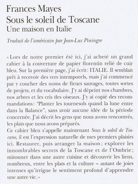 «Lors de notre premier été ici, j'ai acheté un grand cahier à la couverture de papier florentin relié de cuir bleu. Sur la première page, j'ai écrit : ITALIE. Il semblait prêt à recevoir des vers intemporels, mais j'ai commencé par y coucher des noms de fleurs sauvages, toutes sortes de projets, et du vocabulaire. J'y ai dépeint nos chambres, nos arbres et les cris des oiseaux. J'y ai copié des recommandations : "Planter les tournesols quand la lune entre dans la Balance", sans avoir aucune idée de la période concernée. J'ai décrit les gens que nous avons rencontrés, les plats que nous avons préparés.. Ce cahier bleu s'appelle maintenant Sous le soleil de Toscane, il est l'expression naturelle de mes premiers plaisirs ici. Restaurer, puis arranger la maison ; explorer les innombrables secrets de la Toscane et de l'Ombrie ; mitonner dans une autre cuisine et découvrir les liens, nombreux, entre les plats et la culture - autant de joies intenses qu'irrigue le sentiment profond d'apprendre une autre vie.».