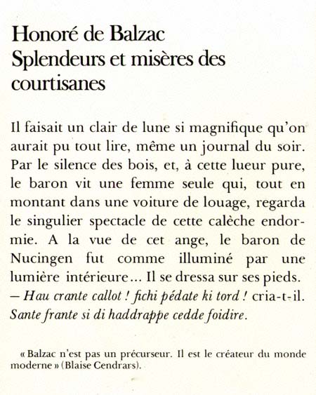 Il faisait un clair de lune si magnifique qu'on aurait pu tout lire, même un journal du soir. Par le silence des bois, et, à cette lueur pure, le baron vit une femme seule qui, tout en montant dans une voiture de louage, regarda le singulier spectacle de cette calèche endormie. A la vue de cet ange, le baron de Nucingen fut comme illuminé par une lumière intérieure... Il se dressa sur ses pieds. - Hau crante callot ! fichi pédate ki tord ! cria-t-il. Sante frante si di haddrappe cedde foidire.. «Balzac n'est pas un précurseur. Il est le créateur du monde moderne» (Blaise Cendrars)..