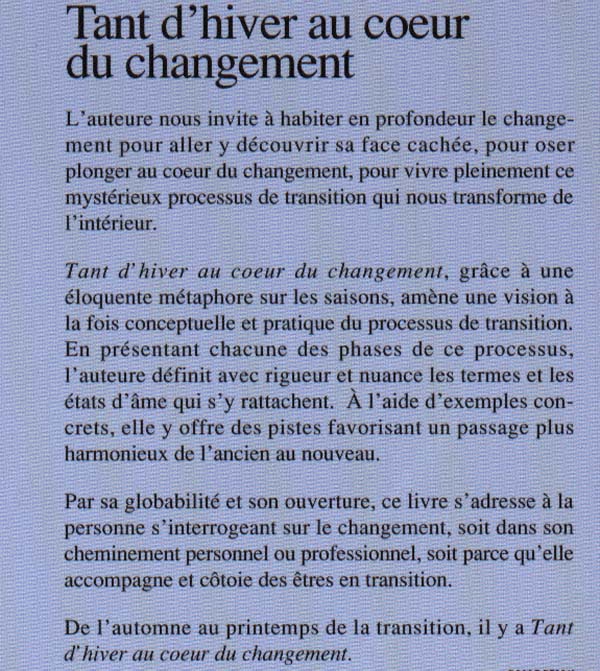 L'auteure nous invite à habiter en profondeur el change- ment pour aller y découvrir sa face cachée, pour oser plonger au coeur du changement, pour vivre pleinement ce mystérieux processus de transition qui nous transforme de l'intérieur. Tant d'hiver au coeur du changement, grâce à une éloquente métaphore sur les saisons, amène une vision à la fois conceptuelle et pratique du processus de transition. En présentant chacune des phases de ce processus, l'auteure définit avec rigueur et nuance les termes et les états d'âme qui s'y rattachent. Àl'aide d'exemples concrets, elle y offre des pistes favorisant un passage plus harmonieux de l'ancien au nouveau. Par sa globabilité et son ouverture, ce livre s'adresse à la personne s'interrogeant sur le changement, soit dans son cheminement personnel ou professionnel, soit parce qu'elle accompagne et côtoie des êtres en transition. De l'automne au printemps de la transition, il y a Tant d'hiver au coeur du changement..