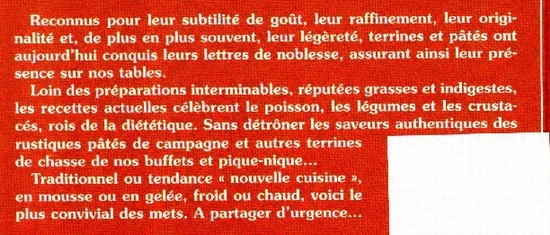 Reconnus pour leur subtilité de goût, leur raffinement, leur originalité et, de plus en plus souvent, leur légèreté, terrines et pâtés ont aujourd'hui conquis leurs lettres de noblesse, assurant ainsi leur présence sur nos tables. Loin des préparations interminables, réputées grasses et indigestes, les recettes actuelles célèbrent le poisson, les légumes et les crustacés, rois de la diététique. Sans détrôner les saveurs authentiques des rustiques pâtés de campagne et autres terrines de chasse de nos buffets et pique-nique... Traditionnel ou tendance « nouvelle cuisine», en mousse ou en gelée, froid ou chaud, voici le plus convivial des mets. A partager d'urgence...