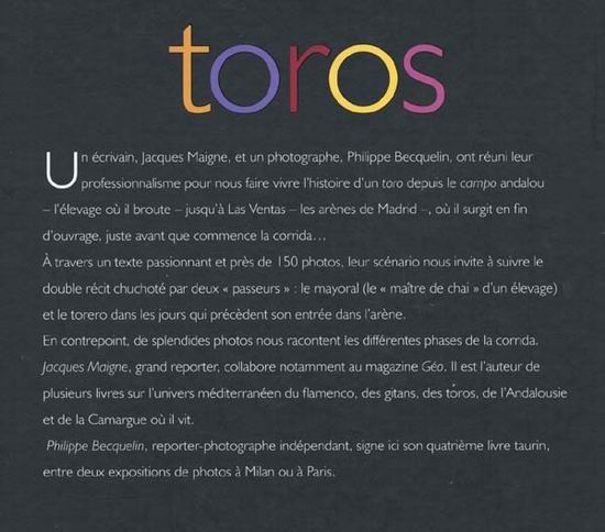 Un écrivain, Jacques Maigne, et un photographe, Philippe Becquelin, ont réuni leur professionnalisme pour nous faire vivre l'histoire d'un toro depuis le compo andalou - l'élevage où il broute - jusqu'à Las Ventas - les arènes de Madrid -, où il surgit en fin d'ouvrage, juste avant que commence la corrida... A travers un texte passionnant et près de 150 photos, leur scénario nous invite à suivre le double récit chuchoté par deux " passeurs " ; le mayoral (le " maître de chai " d'un élevage) et le torero dans les jours qui précèdent son entrée dans l'arène. En contrepoint, de splendides photos nous racontent les différentes phases de la corrida.