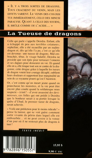 Mal embouchée, têtue, le visage balafré, Deirdra ne possède que son épée pour terrasser l’ennemi et ses dagues pour demeurer en vie. Et quand elle en a, elle troque tout son or contre de la dragonne, cette drogue grâce à laquelle les tueurs de dragon voient leur courage décuplé, oublient leurs douleurs et supportent leur marginalité au sein de ce royaume pourri qu’est l’Austrion. Or, c’est connu qu’on meurt jeune quand on pourchasse les monstres, et la vie peut être encore plus courte quand la soldatesque nous suspecte – à tort ! – d’avoir assassiné des devineresses, ces folles qui ont prédit à Deirdra que le bonheur serait à sa portée lorsque la quête d’Ubad, le premier tueur de dragons, serait achevée.