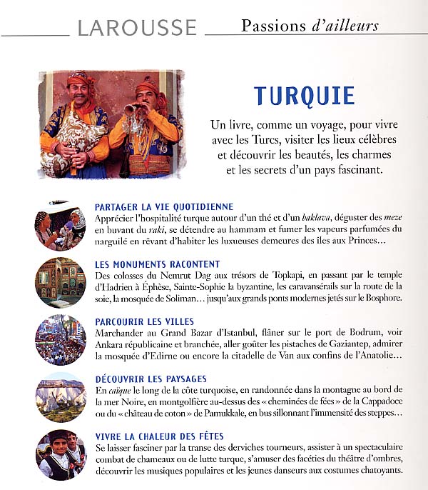 Propose la découverte de ce pays à partir des centres d'intérêt du voyageur et permet de mieux connaître la vie quotidienne des habitants, l'histoire de la Turquie, les villes, les sites naturels, ainsi que les loisirs, les fêtes et la culture contemporaine turque.