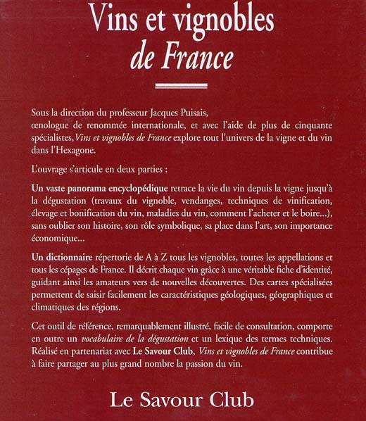 Sous la direction du professeur Jacques Puisais, œnologue de renommée internationale, et avec l'aide de plus de cinquante spécialistes, Vins et vignobles de France explore tout l'univers de la vigne et du vin dans l'Hexagone. L'ouvrage s'articule en deux parties : Un vaste panorama encyclopédique retrace la vie du vin depuis la vigne jusqu'à la dégustation (travaux du vignoble, vendanges, techniques de vinification, élevage et bonification du vin, maladies du vin, comment l'acheter et le boire...), sans oublier son histoire, son rôle symbolique, sa place dans l'art, son importance économique... Un dictionnaire répertorie de A à Z tous les vignobles, toutes les appellations et tous les cépages de France. Il décrit chaque vin grâce à une véritable fiche d'identité, guidant ainsi les amateurs vers de nouvelles découvertes. Des cartes spécialisées permettent de saisir facilement les caractéristiques géologiques, géographiques et climatiques des régions. Cet outil de référence, remarquablement illustré, facile de consultation, comporte en outre un vocabulaire de la dégustation et un lexique des termes techniques. Réalisé en partenariat avec Le Savour Club, Vins et vignobles de France contribue à faire partager au plus grand nombre la passion du vin.