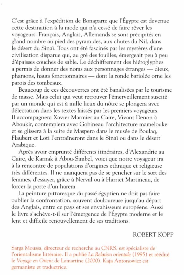" C'est grâce à l'expédition de Bonaparte que l'Egypte est devenue cette destination à la mode qui n'a cessé de faire rêver les voyageurs. Français, Anglais, Allemands se sont précipités en grand nombre au pied des pyramides, aux chutes du Nil, dans le désert du Sinaï. Tous ont été fascinés par les mystères d'une civilisation disparue qui, au gré des fouilles, émergeait peu à peu d'épaisses couches de sable. Le déchiffrement des hiéroglyphes a permis de donner des noms aux personnages étranges - dieux, pharaons, hauts fonctionnaires - dont la ronde bariolée orne les parois des tombeaux. Beaucoup de ces découvertes ont été banalisées par le tourisme de masse. Mais celui qui veut retrouver l'émerveillement suscité par un monde qui est à mille lieux du nôtre se plongera avec délectation dans les textes laissés par les premiers voyageurs. Il accompagnera Xavier Marmier au Caire, Vivant Denon à Aboukir, contemplera avec Gobineau l'architecture mamelouke et se glissera à la suite de Maspero dans le musée de Boulaq, Flaubert et Loti l'entraîneront dans le Sinaï ou dans le désert Arabique. Après avoir emprunté différents itinéraires, d'Alexandrie au Caire, de Karnak à Abou-Simbel, voici que notre voyageur ira à la rencontre de populations d'origines ethnique et religieuse très différentes. Il ne manquera pas de se pencher sur le sort des femmes, d'essayer, grâce à Nerval ou à Harriet Martineau, de forcer la porte d'un harem. La peinture pittoresque du passé égyptien ne doit pas faire oublier la confrontation, souvent douloureuse jusqu'au départ des Anglais, entre ce pays et ses envahisseurs européens. Aussi le livre s'achève-t-il sur l'émergence de l'Égypte moderne et le lent et difficile renouvellement de ses traditions. " Robert Kopp