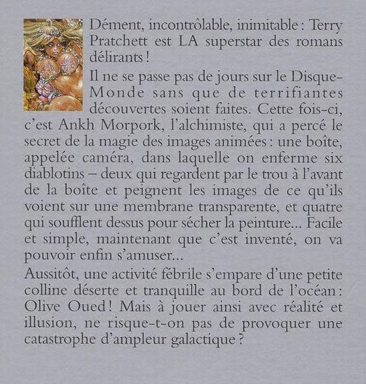 Dément, incontrôlable, inimitable : Terry Pratchett est LA superstar des romans délirants !. Il ne se passe pas de jours sur le Disque-Monde sans que de terrifiantes découvertes soient faites. Cette fois-ci, c'est Ankh Morpork, l'alchimiste, qui a percé le secret de la magie des images animées : une boîte, appelée caméra, dans laquelle on enferme six diablotins - deux qui regardent par le trou à l'avant de la boîte et peignent les images de ce qu'ils voient sur une membrane transparente, et quatre qui soufflent dessus pour sécher la peinture... Facile et simple, maintenant que c'est inventé, on va pouvoir enfin s'amuser.... Aussitôt, une activité fébrile s'empare d'une petite colline déserte et tranquille au bord de l'océan : Olive Oued ! Mais à jouer ainsi avec réalité et illusion, ne risque-t-on pas de provoquer une catastrophe d'ampleur galactique ?.