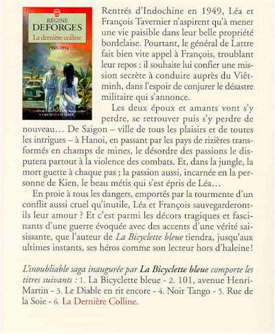 Rentrés d'Indochine en 1949, Léa et François Tavernier n'aspirent qu'à mener une vie paisible dans leur propriété bordelaise. Mais le général de Lattre fait bientôt appel à François, afin de lui confier une mission secrète auprès du Viêt-minh, dans l'espoir de conjurer le désastre militaire qui s'annonce. . De Saigon - ville de tous les plaisirs et de toutes les intrigues - à Hanoi, en passant par les rizières transformées en champs de mines, le désordre des passions le dispute partout à la violence des combats. Et, dans la jungle, la mort guette à chaque pas ; la passion aussi, incarnée par Kien, le beau métis qui s'est épris de Léa... En proie à tous les dangers, emportés par la tourmente d'un conflit aussi cruel qu'inutile, Léa et François sauveront-ils leur amour ? . L'inoubliable saga inaugurée par La Bicyclette bleue comporte les titres suivants : 1. La Bicyclette bleue - 2. 101, avenue Henri-Martin - 3. Le Diable en rit encore - 4. Noir Tango - 5. Rue de la Soie - 6. La Dernière Colline - 7. Cuba libre ! - 8. Alger, ville blanche - 9. Les Généraux du crépuscule - 10. Et quand viendra la fin du voyage....