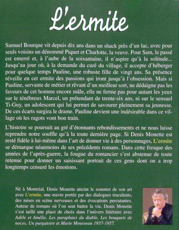 Natif de Montréal, Denis Monette est l'un des romanciers les plus lus au Québec et dans la francophonie des autres provinces. Avec plus d'un demi-million d'exemplaires vendus - ses romans sont tous des best-sellers -, on ne saurait passer sous silence des titres tels que Adèle et Amélie, Les parapluies du diable, Les bouquets de noces, Marie Mousseau 1937-1957, Un purgatoire, Et Mathilde chantait, La maison des regrets, Par un si beau matin, sans oublier sa trilogie qui se compose de L'ermite, Pauline Pinchaud, servante, et Le rejeton, qui fut acclamée partout. De plus, l'auteur a publié au cours des ans six recueils de billets, desquels émane une belle philosophie de la vie.
