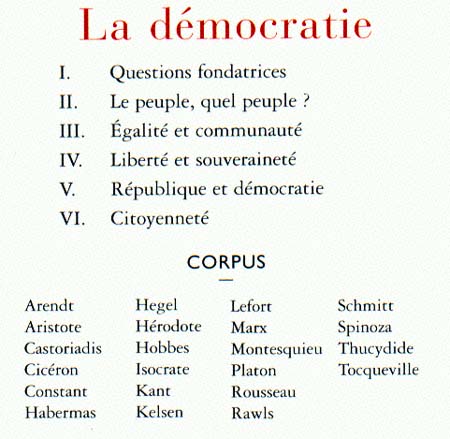 La démocratie vue par Aristote, Cicéron, Hobbes, Kant, Platon, Rousseau, Spinoza, Tocqueville, entre autres. Une définition des termes : assemblée, citoyen, Constitution, gouvernement, république, souveraineté, vertu, etc.
