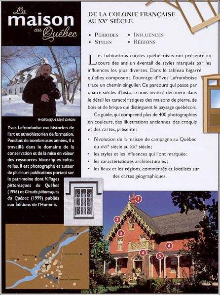 Les habitations rurales québécoises ont présenté au cours des ans une diversité de styles marqués par les influences les plus diverses. Dans le tableau bigarré qu’elles composent, l’ouvrage d’Yves Laframboise trace un chemin singulier. Ce parcours qui passe par quatre siècles d’histoire nous invite à découvrir dans le détail les caractéristiques des maisons de pierre, de bois et de brique qui distinguent le paysage québécois. Au moyen d’illustrations anciennes, de croquis et de cartes, de photographies largement commentées, ce guide présente : l’évolution de la maison de campagne au Québec du XVIIe siècle au XXe siècle ; les styles et les influences qui l’ont marquée ; les caractéristiques architecturales ; les régions et les lieux, commentés et localisés sur cartes géographiques. Cette histoire illustrée vous propose une visite inusitée du Québec à travers ses particularités régionales.